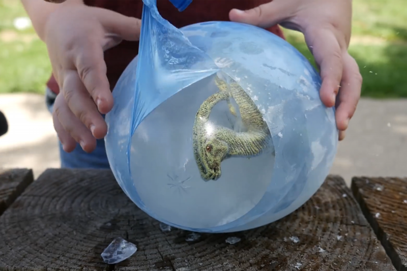 Оригинальная и интересная идея для детей дошкольного и младшего школьного возраста, которым нравится тема динозавров. Возьмите фигурку животного и засуньте ее аккуратно в воздушный шарик, который затем нужно наполнить водой (для красочности игры, добавьте в воду яркий пищевой краситель). Завяжите крепко шарик с водой и оставьте в морозилке на один день. Когда пришло время, достаньте заготовку и пускай ребенок проведет «раскопки» - разрежет шарик и извлечет фигурку из льда с помощью небольшого молоточка.
