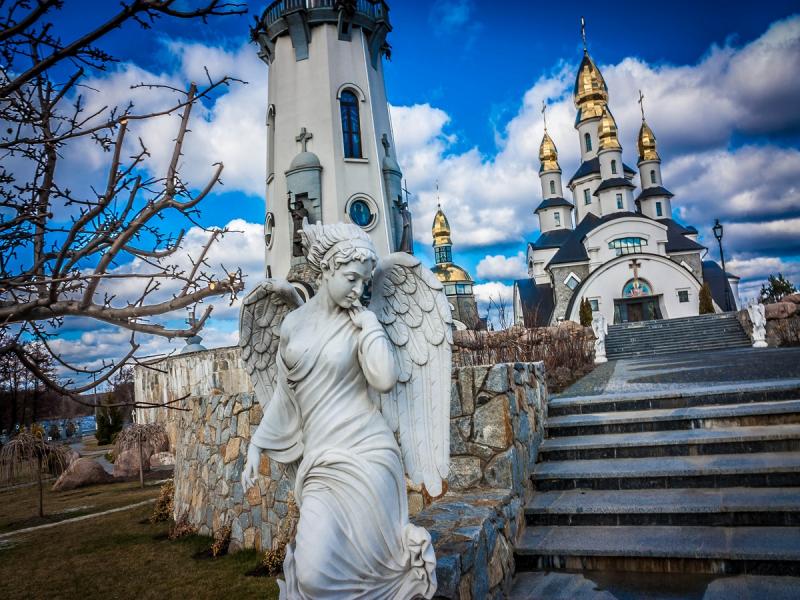 Комплекс включає в себе церква Святого Євгенія, дзвіницю Данила. Поруч розміщений фонтан, який раніше стояв на майдані Незалежності в Києві. Після реконструкції площі його демонтували. Фонтан багато років пролежав без діла, деякі деталі зламалися, кілька вкрали. Місцеві майстри його відремонтували, реставрували і доповнили освітленням.