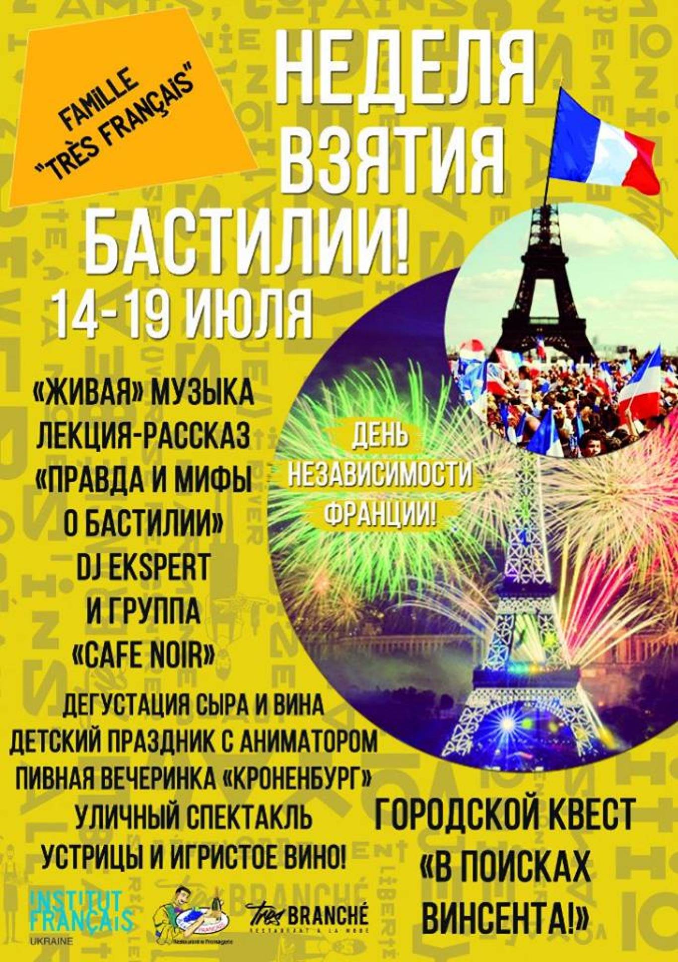15 июля, в 19:00, в "Арт-зале" ресторан и сырной лавки Tres FRANCAIS (Костельная, 3) под бокал французского вина от заведения, пройдет исторический экскурс-рассказ "Правда и мифы о Бастилии" (Вход свободный).
