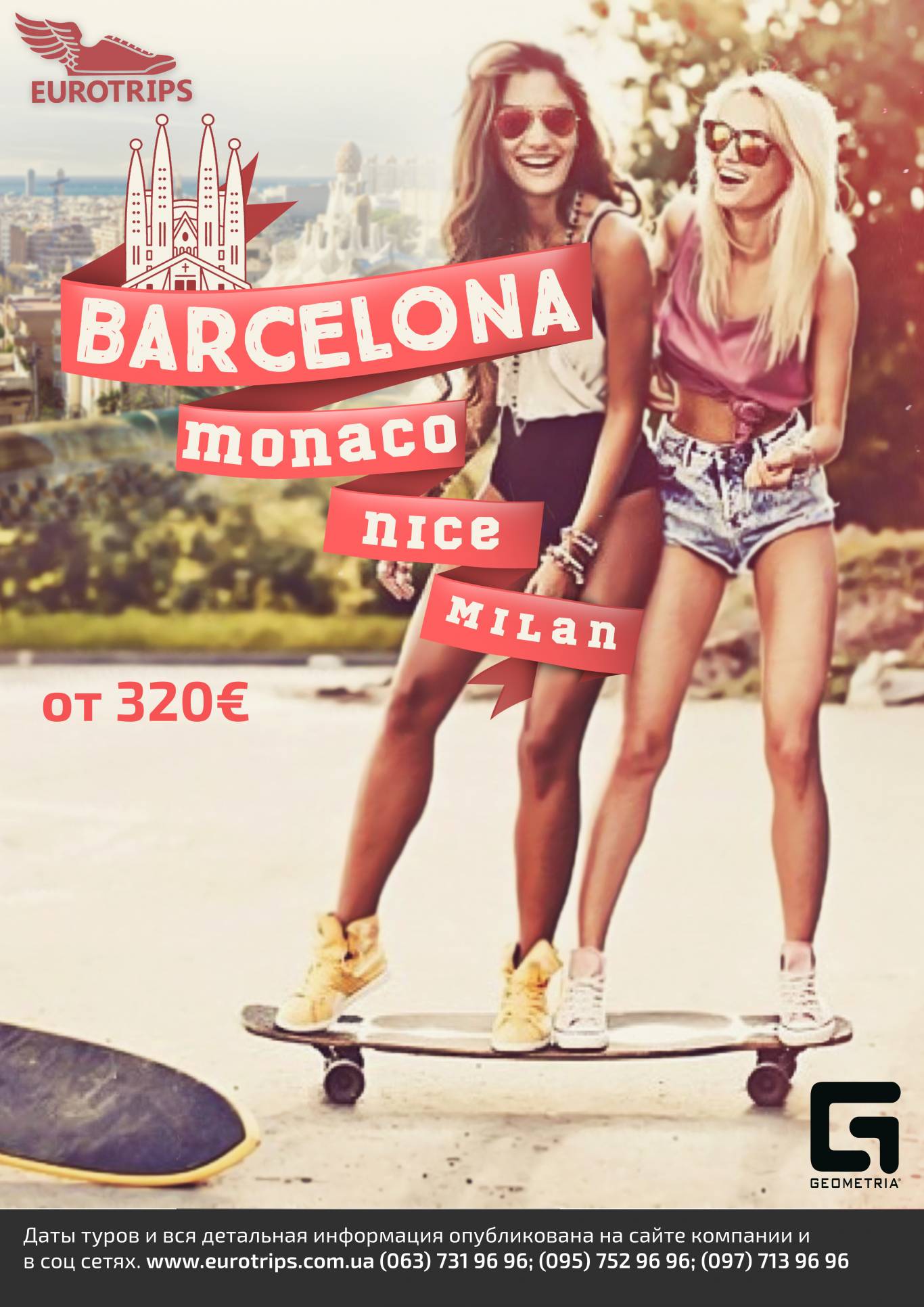 Зелені парки Барселони, вузьки вулички Ніцци, нічні клуби на пляжах Монако, шоппінг в Мілані, жарке сонце Лазурного берега, запальне фламенко, свіжі морепродукти та справжня італійська піцца! Це лице 1/100 того, що чекатиме нас в євротурі Барселона-Ніцца-Монако-Мілан!