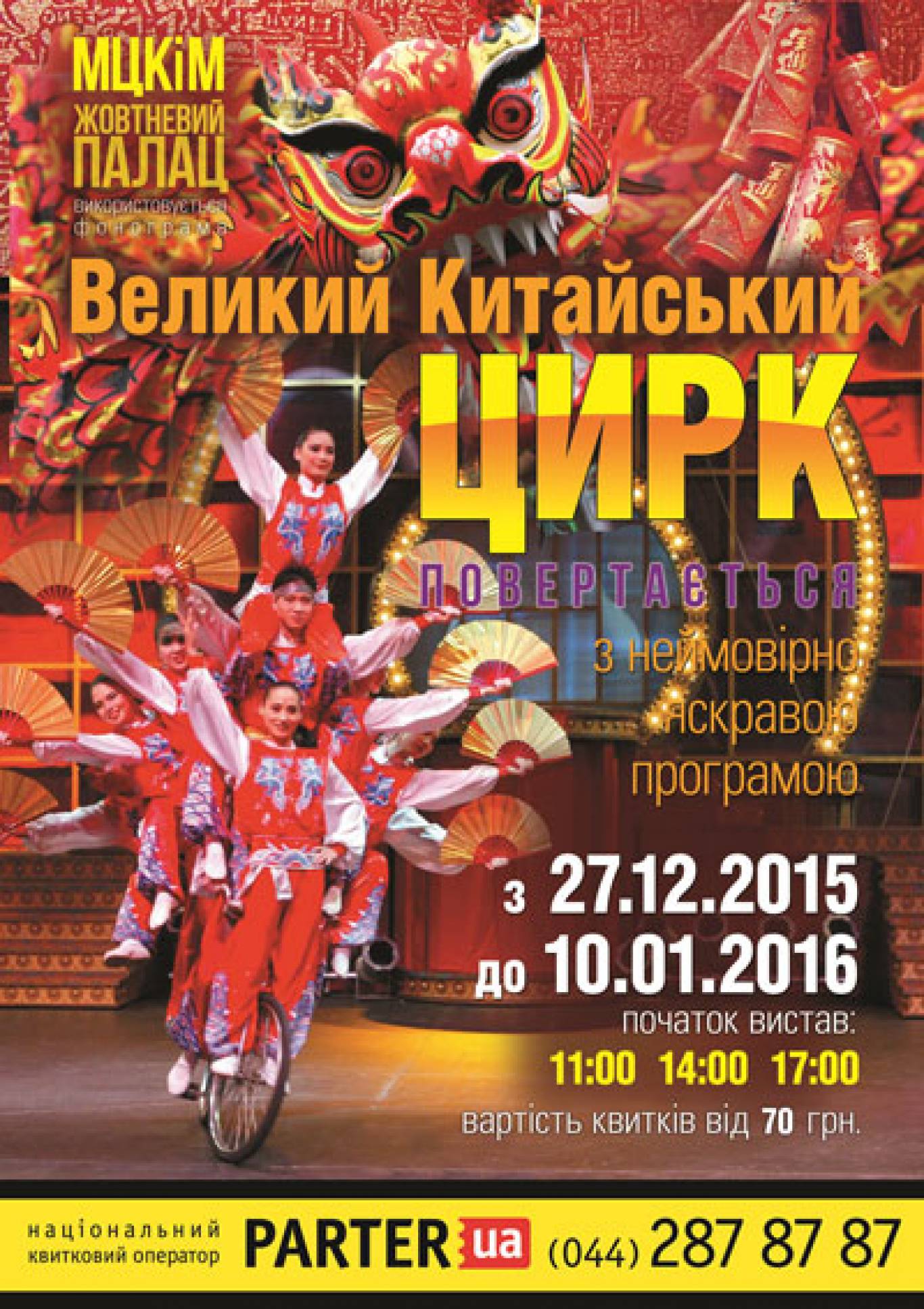 З 27.12.15 по 10.01.2016 в Київському Міжнародному Центрі культури і мистецтв (Жовтневий палац) відомий Великий Китайський Цирк представить унікальне екзотичне новорічне шоу для маленьких і дорослих глядачів!