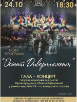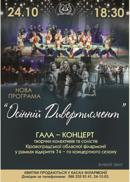 24 жовтня в Кіровоградській обласній філармонії відбудеться святковий концерт з оновленою програмою “Осінній Дивертисмент”.