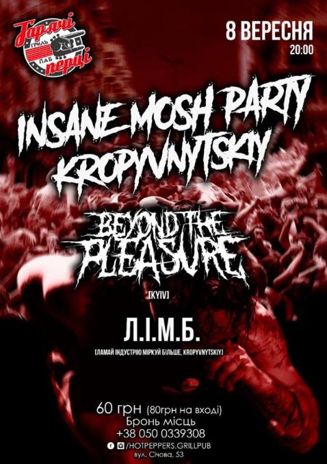 8 вересня у Кропивницькому відбудеться Insane Mosh Party Kropyvnytskyi. Хедлайнерами виступлять Beyond the Pleasure - брутали зі столиці, учасники The Best Ukrainian Metal Act 2017, що вже випустили два міні-альбоми на не планують на цьому зупинятися. Також на вечірці гратиме місцевий гурт Л.І.М.Б.