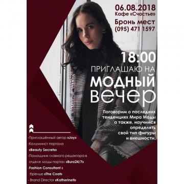 6 серпня в кафе “Счастье” відбудеться “Модний вечір”, який проведе Дарина Броншпіц - запрошений автор “JOY”, колумніст порталу “Beauty Secrets”, помічник головного редактора у відділі моди порталу “Buro 24/7” та консультант моди.