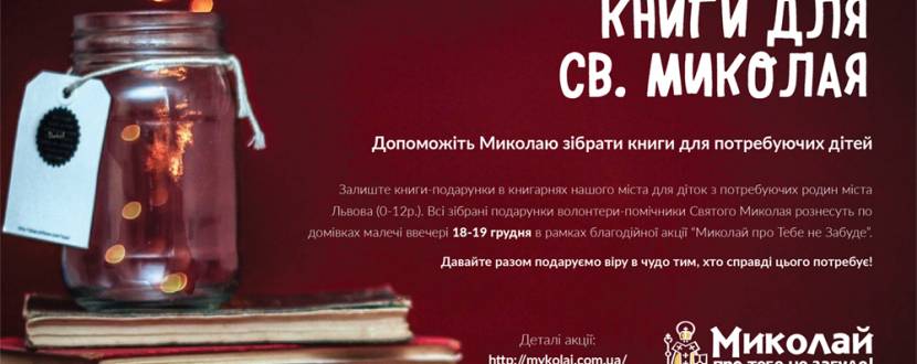 Книги-подарунки для діток з потребуючих родин можна залишити у книгарнях міста Лева. Усе зібране волонтери-помічники Святого Миколая рознесуть по домівках малечі.