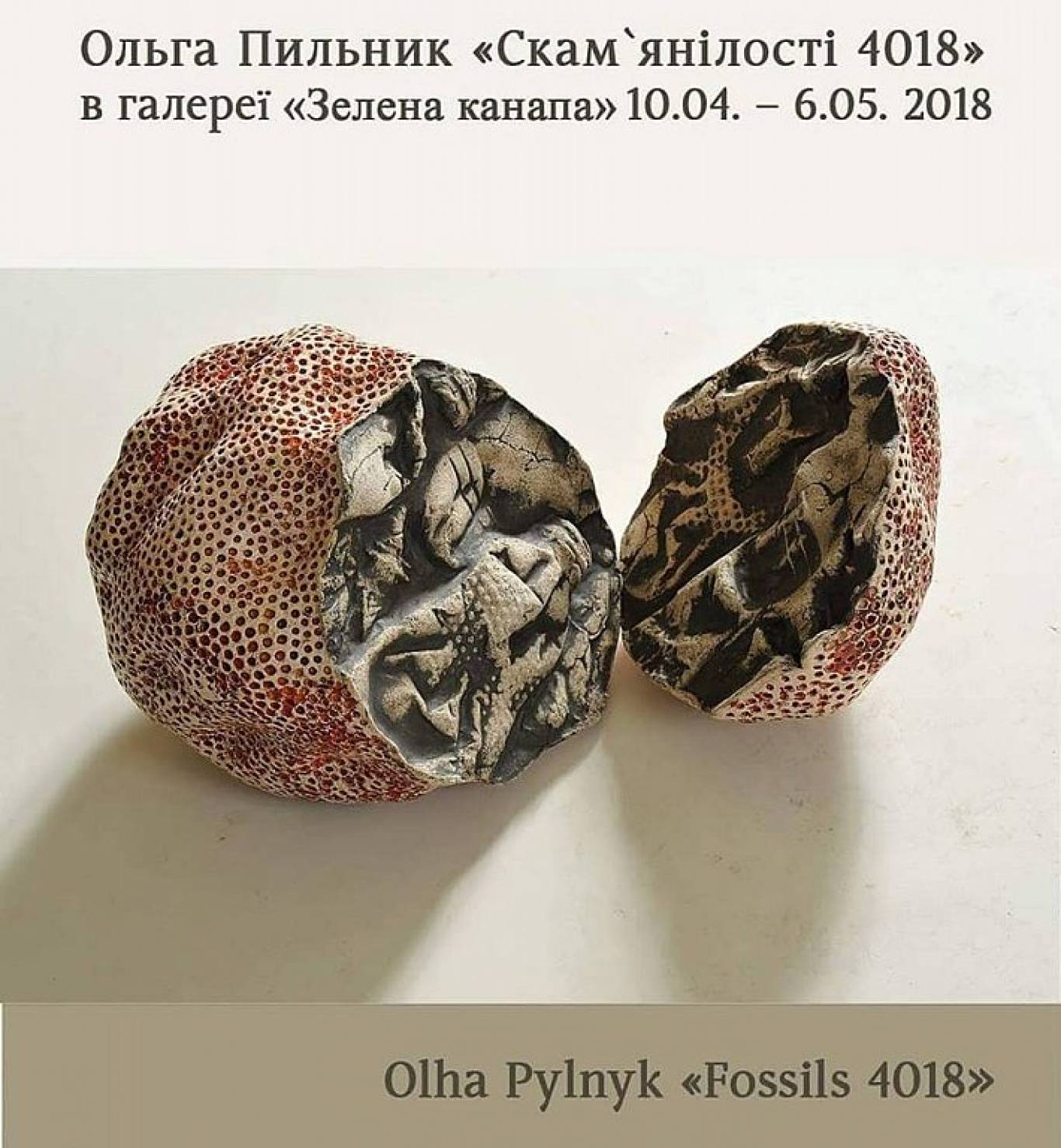 Виставка Ольги Пильник "Скам`янілості 4018" проходитиме у Галереї сучасного мистецтва "Зелена канапа" з 10 квітня до 6 травня. Вхід - вільний.