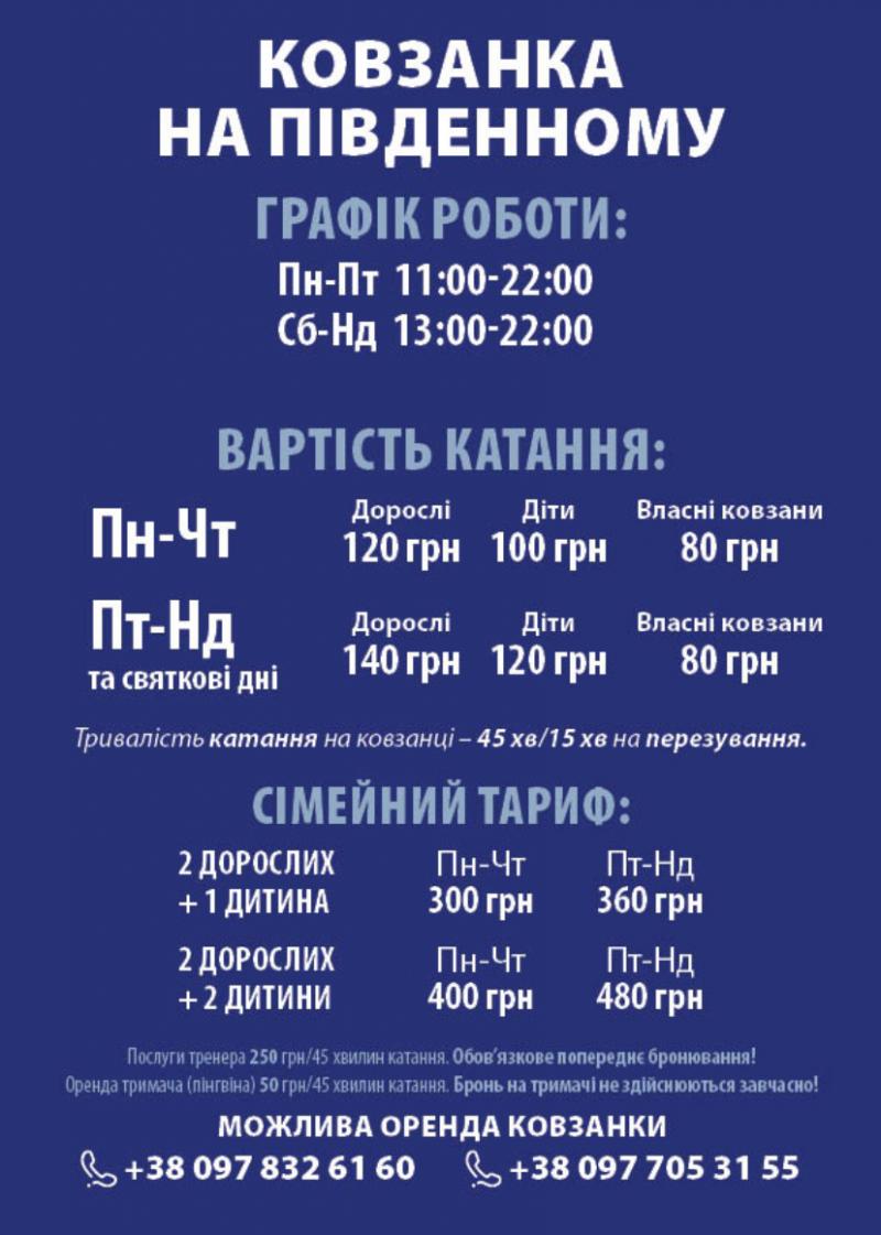 "Ковзанка на "Південному" - це ідеальне місце для романтичних побачень, а ще місце, де можна весело та оригінально провести час із друзями, або ж порозважатися цілою сім’єю. На льодовій гладі Ви втратите відчуття віку і порините в феєричну атмосферу. І не має значення, чи Ви впевнено стоїте на ковзанах, чи одягнули їх вперше. Наші інструктори позбавлять Вас відчуття дискомфорту", - додають організатори.