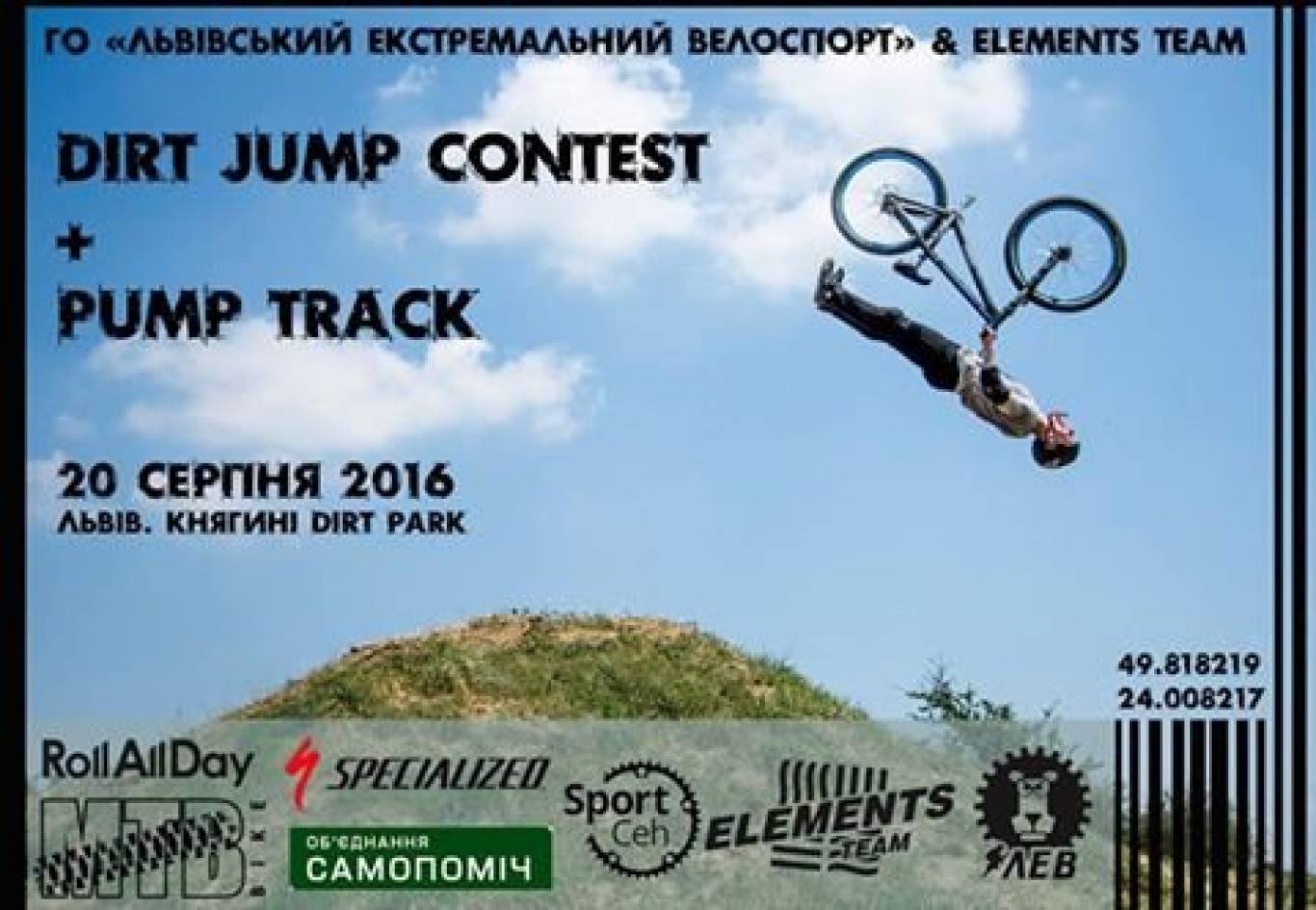 Змагання з екстремальних велодисциплін Dirt Jump Contest та Pump Track відбудеться у парку "Горіховий гай" 20 серпня. Початок - о 10.00. Вхід - вільний.