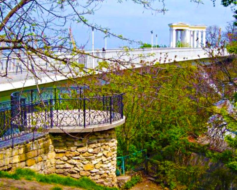 Тещин мост - самый высокий в Одессе, протянутый над Военным спуском..Имеет несколько версий своего названия. По одной из версий он такой же длинный и острый как язык тещи, а по второй версии, он был построен бывшим председателем горкома Михаилом Синицей для того, чтобы сократить путь к любимой теще, куда он любил захаживать на блины, но путь без моста был довольно длинным. Если немного постоять на мосту, можно заметить, что он слегка вибрирует. Все из-за конструкции сооружения: целиком из железобетона, без промежуточных опор, он гибко