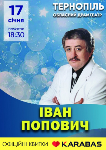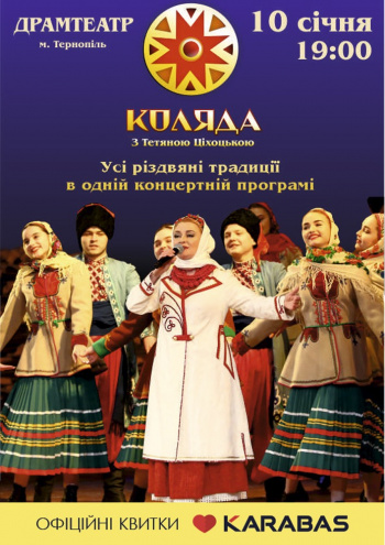 Відкриє концертний січень Тетяна Ціхоцька. “Коляда з Тетяною Ціхоцькою” – концертна програма, яка вже більше 15 років дарує глядачам неповторну атмосферу різдвяних свят. Програма складається з різдвяних пісень, колядок, щедрівок, традицій “Водіння Маланки”, “Перебіранців”. Концерт відбудеться в Тернопільському академічному обласному українському драматичному театрі Т. Г. Шевченка.