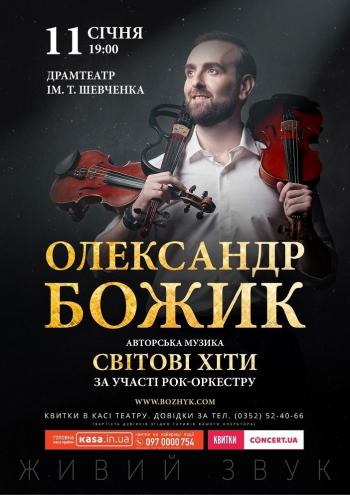 Найдрайвовіший концерт цієї зими! Масштабне музичне дійство на чолі з скрипалем-віртуозом Олександром Божиком у супроводі потужного рок-оркестру охопить увесь спектр ваших емоцій! Світові хіти, авторська музика, класика у сучасній обробці та саундтреки до кінофільмів – усе це органічно поєдналося в неймовірно-енергетичному музичному шоу, яке було занесено до «Книги Рекордів України»!