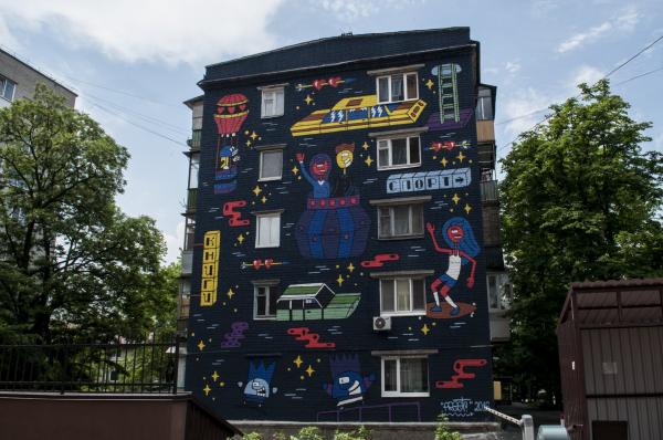Особливість роботи столичного художника Артема Прута у тому, що допомагав йому у створенні муралу юний помічник - хлопчик із діагнозом ДЦП Артем. Подивитися на роботу над п'ятиповерховим полотном та навіть взяти пензля до рук приїздив і мер Києва Віталій Кличко.