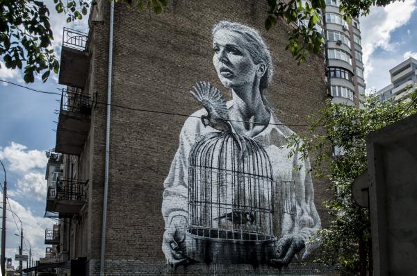 Чорно-білий мурал, із зображенням дівчини, в руках якої клітка з двома птахами. Робота стала не першою у доробку молодого художника Саші Корбана, який вже прикрасив своїми стріт-картинами кілька будинків у Києві.