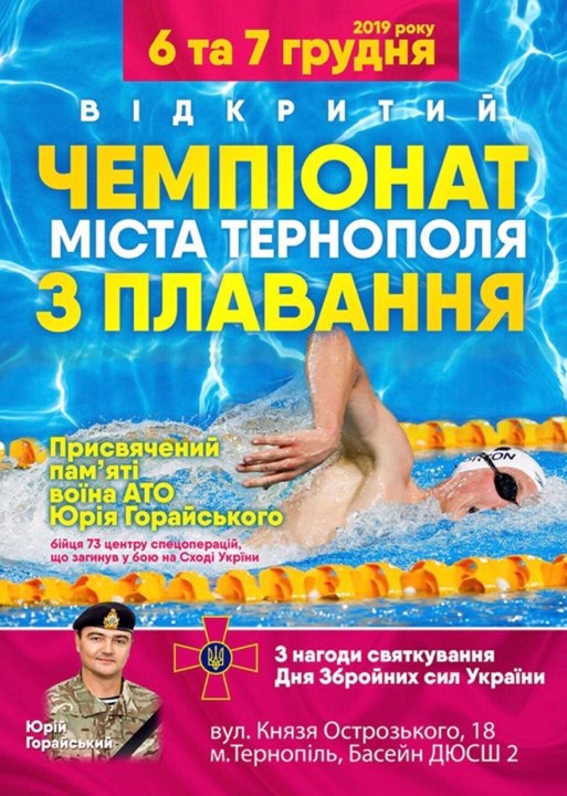 З нагоди святкування Дня Збройних сил України 6-7 грудня відбудеться відкритий чемпіонат міста Тернополя з плавання присвячений пам'яті воїна АТО Юрія Горайського бійця 73 центру спецоперацій, що загинув в бою на Сході України.