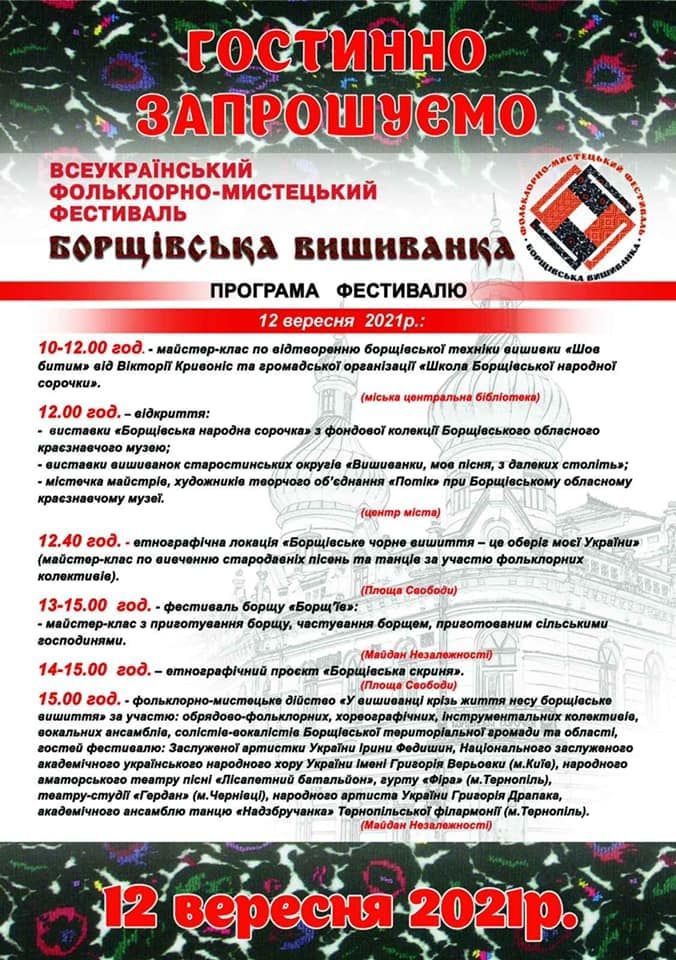 12 вересня 2021 року в м. Борщеві відбудеться XIII Всеукраїнський фольклорно–мистецький фестиваль «Борщівська вишиванка».
