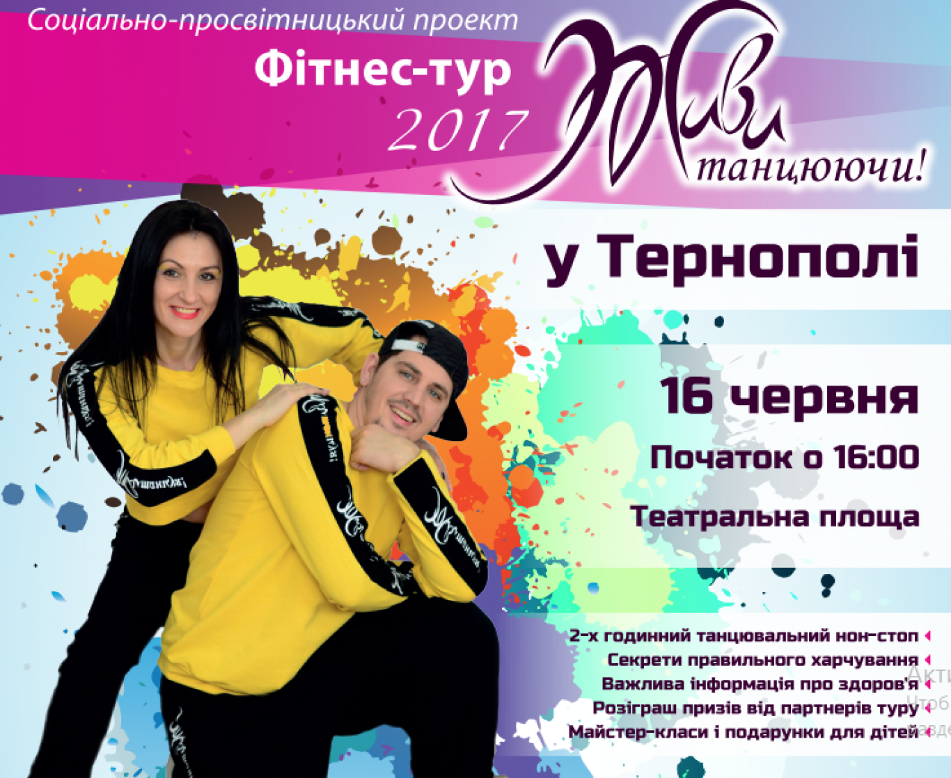 16 червня Тернопіль відвідає фітнес-тур «Живи танцюючи». Фітнес-тур відвідав вже п'ять міст України: Суми, Полтаву, Бориспіль, Херсон і Вінницю. Але попереду ще багато міст, до яких завітає танцювальний флешмоб в 2017 році. На черзі - Тернопіль, де фітнес нон-стоп відбудеться в центрі міста, а саме на Театральній площі.