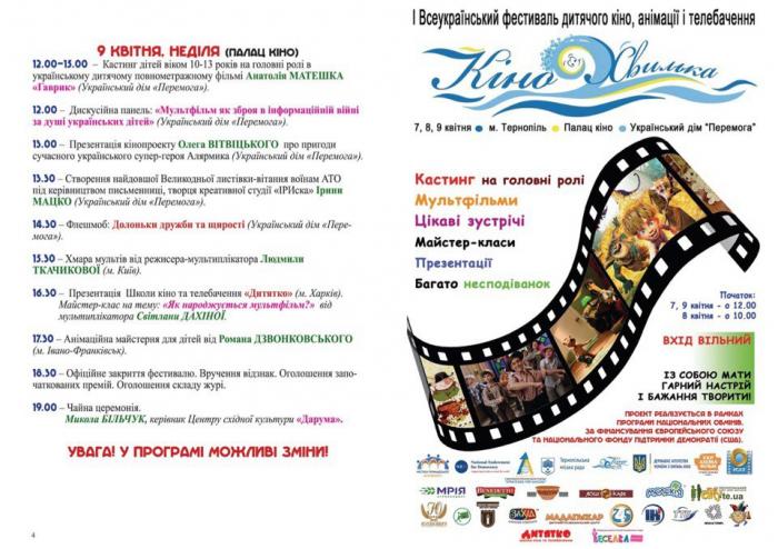 З 7 по 9 квітня у Тернополі пройде Перший Всеукраїнський фестиваль дитячого кіно, анімації і телебачення "КіноХвилька". До обласного центру з'їдуться творці дитячого кіно з різних регіонів України.