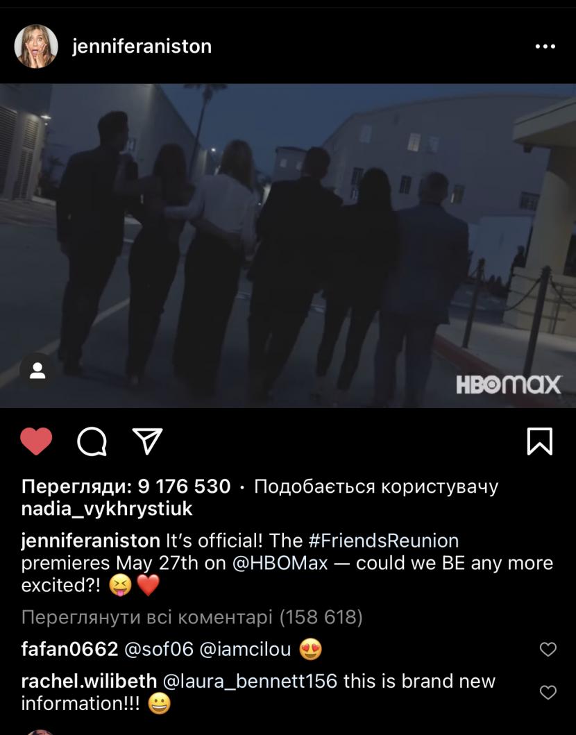 Зовсім нещодавно закінчилися зйомки "Друзі: Воз'єднання". Офіційний акаунт ситкому в Instagram підтвердив цю новину. Дженніфер Еністон (Рейчел), Кортні Кокс (Моніка), Ліза Кудроу (Фібі), Метт Леблан (Джоуї), Меттью Перрі (Чендлер) і Девід Швіммер (Росс) виступили виконавчими продюсерами серіалу.