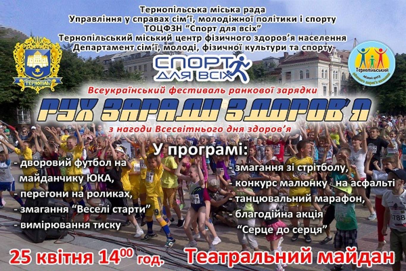 Змагання з дворового футболу, конкурс малюнку на асфальті, руханку, марафон танцювальних колективів та безліч інших змагань обіцяють провести у Тернополі в суботу, 25 квітня, на Театральному майдані. Початок о 14.00.