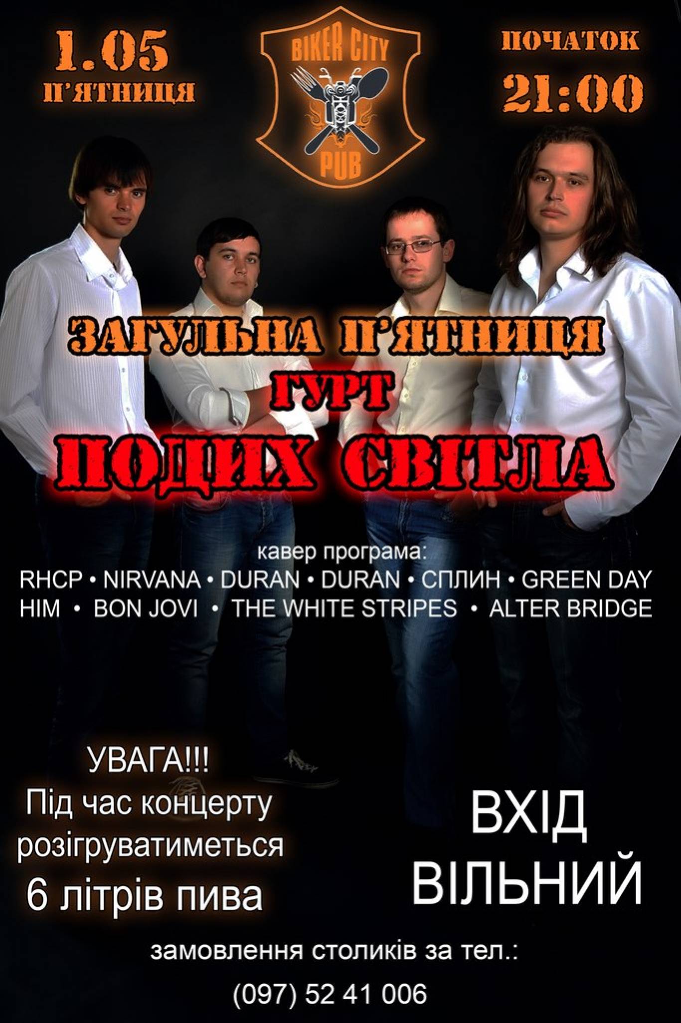 1 травня, в п'ятницю завітай у Biker City Pub і насолодись атмосферною музикою від рок-гурту «Подих світла».