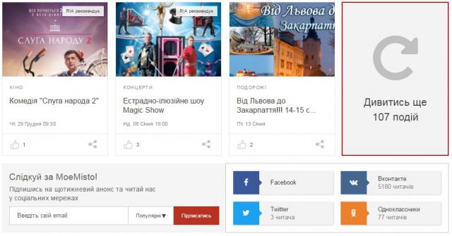 На головній сторінці читач не побачить всі анонси одразу. Для почтаку пропонується лише 4 ряди з афішами подій. Усі ж актуальні майбутні події “ховаються” під кнопкою “Дивитись ще”, на якій вказана та кількість афіш, які опубліковані нижче.