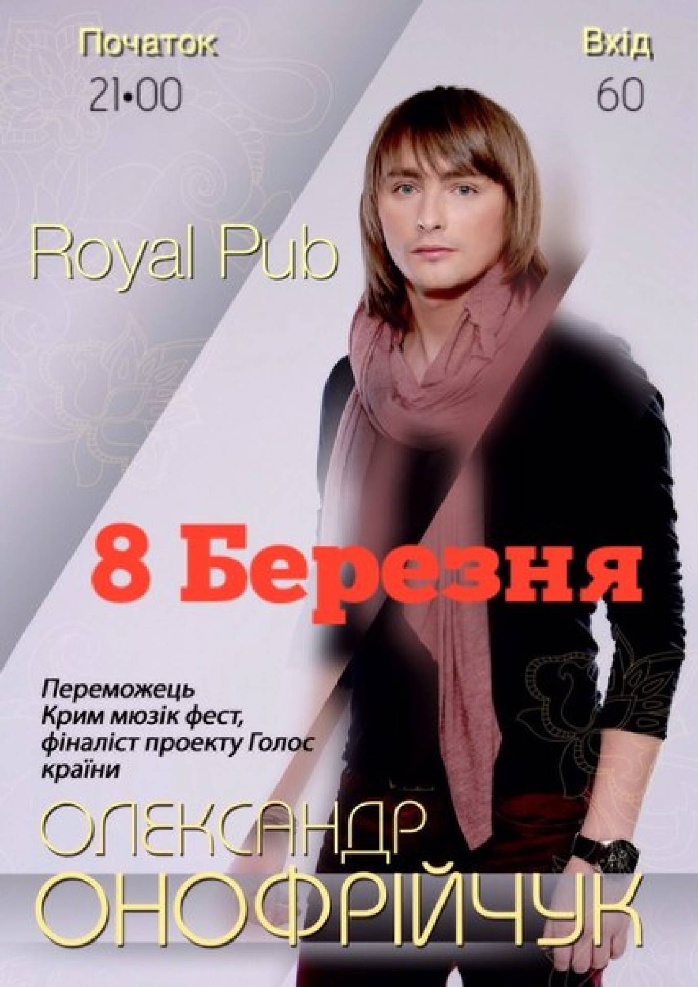 ROYAL PUB запрошує відсвяткувати міжнародний жіночий день - 8 березня в компанії фіналіста шоу "Голос країни" - Олександра Онофрійчука. Співак виконає найкращі та найпопулярніші світові хіти та привітає жіночу половину країни зі святом!