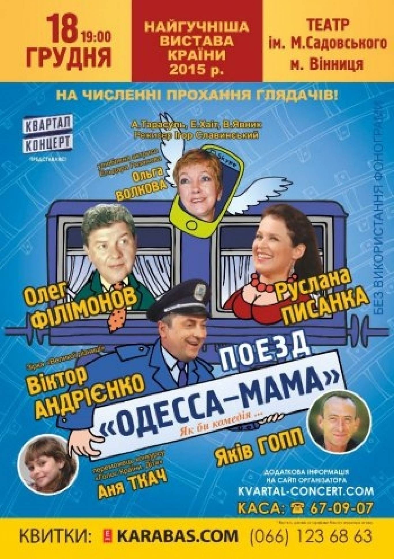 На численні прохання глядачів 18 грудня у Вінниці на сцені Вінницького музично-драматичного театру ім. Садовського комедія - вистава "Поїзд Одеса-Мама" від творців вистави "Ураган по імені Одеса".
