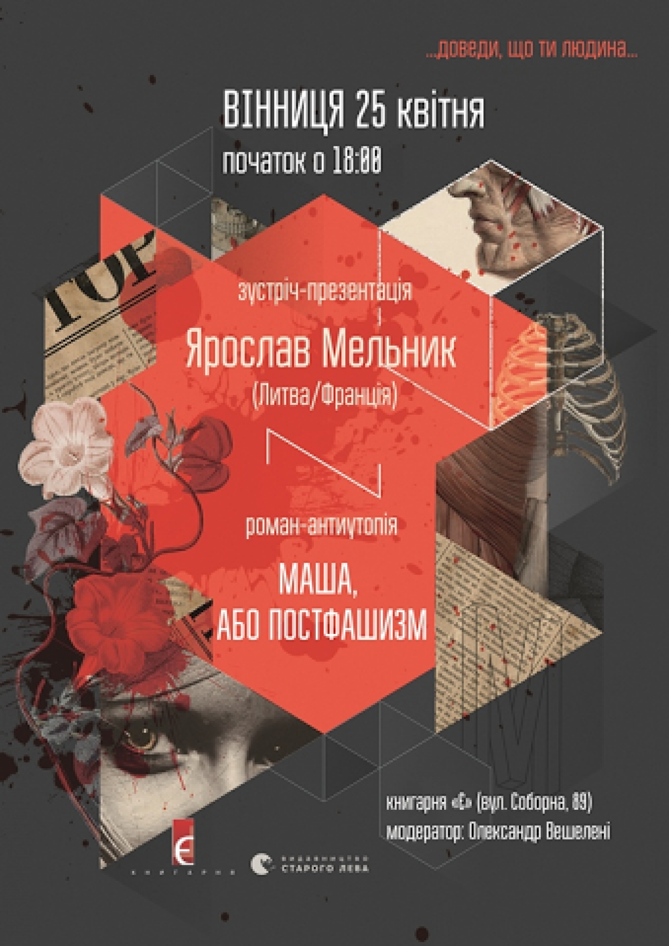 Книгарня «Є» та «Видавництво Старого Лева» запрошують на презентацію роману Ярослава Мельника «Маша, або Постфашизм», яка відбудеться 25 квітня за участю автора.