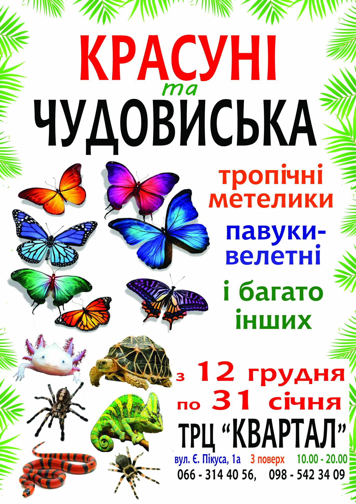 Запрошуємо Вас на дивовижну виставку "КРАСУНІ та ЧУДОВИСЬКА", на якій Вам представиться можливість насолодитися красою та побачити появу на світ тропічних метеликів, дізнатися цікаві факти про життя цих чарівних істот. Крім цього, на виставці представлені гігантські павуки-птахоїди з усього світу, водні та сухопутні черепахи, граційні яскраві змії, незвичайні ящірки, різноманітні жаби, аксолотлі, африканські карликові їжаки, чилійські білочки, комахи і молюски.