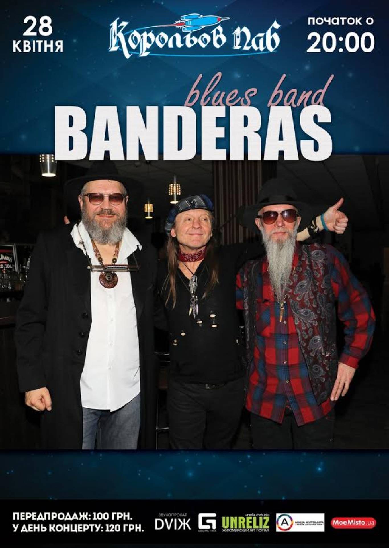 28.04. - концерт BANDERAS BLUES BAND (м. Харків) у "Корольов Пабі". Дуже особливий колектив, що грає ROCK- COUNTRY-FUNKY-REGGEY-SKA-RUMBA-ETHNO. Їх неповторне звучання, авторське трактування каверів, пісні власного виконання, яскравий вокал, та віртуозна гра - вигідно вирізняють Banderas Blues Band серед сучасних колективів, що грають у стилі блюз на рок-н -ролл!!! Квитки: - передпродаж 100 грн. - в день концерту - 120 грн. Телефонуй та бронюй столик: 466-027, 063-062-40-71, 063-746-59-65