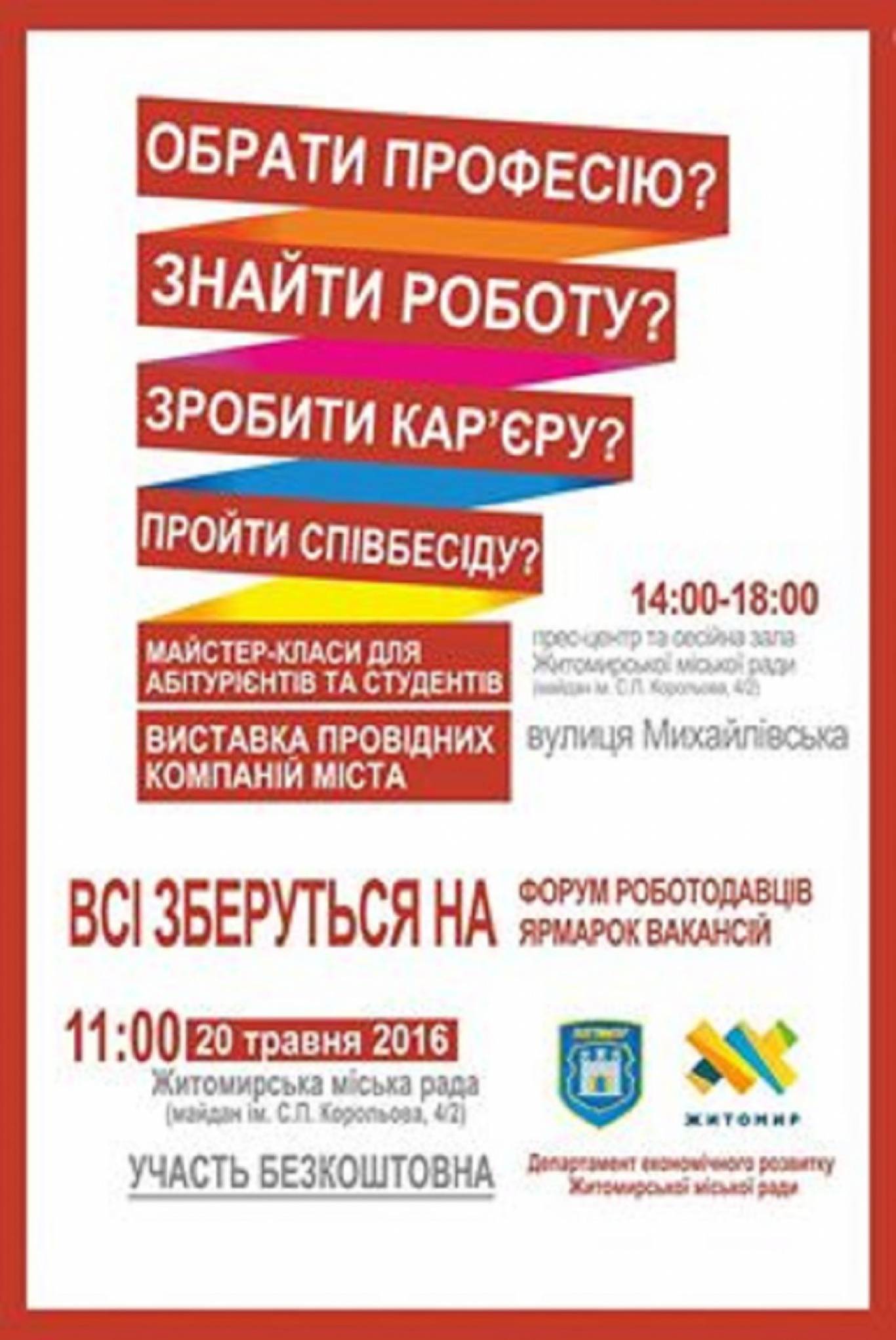Департамент економічного розвитку Житомирської міської ради, який є його безпосереднім організатором, запрошує до участі підприємства, вузи, коледжі, профтехучилища, кадрові агенції, центр зайнятості та жителів міста.