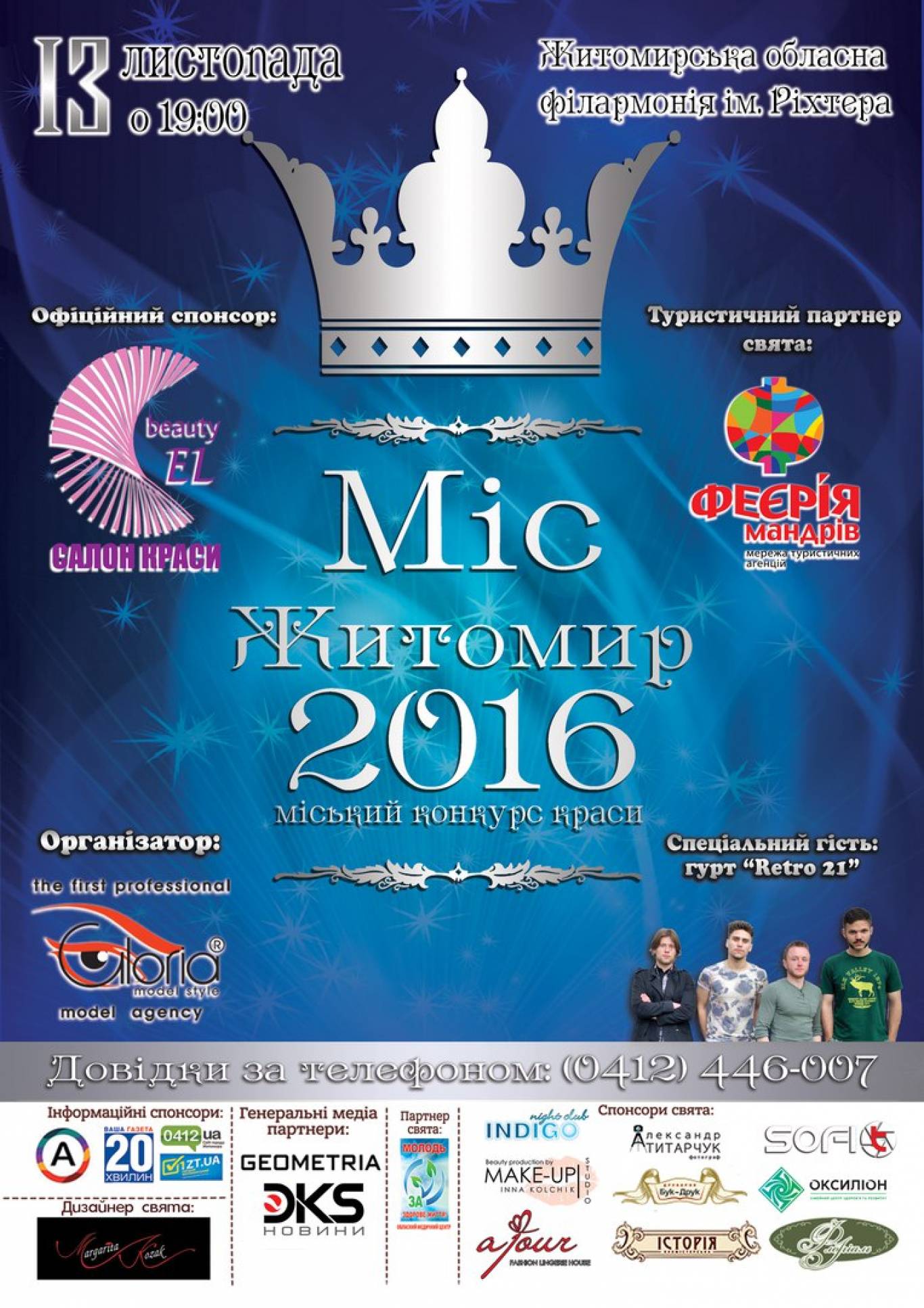13 листопада о 19.00 , Житомирська обласна філармонія ім. С. Ріхтера Переможниця конкурсу отримає у подарунок туристичний тур до Єгипту від нашого Тур партнера "Феєрія мандрів"! Спеціальний гість конкурсу: молодий та набираючий популярності креативний гурт Ретро 21! Хлопці мають своє звучання) Довідка та придбання квитків за номером: (0412) 446-007, 096 96 41 078 #gloriamodels