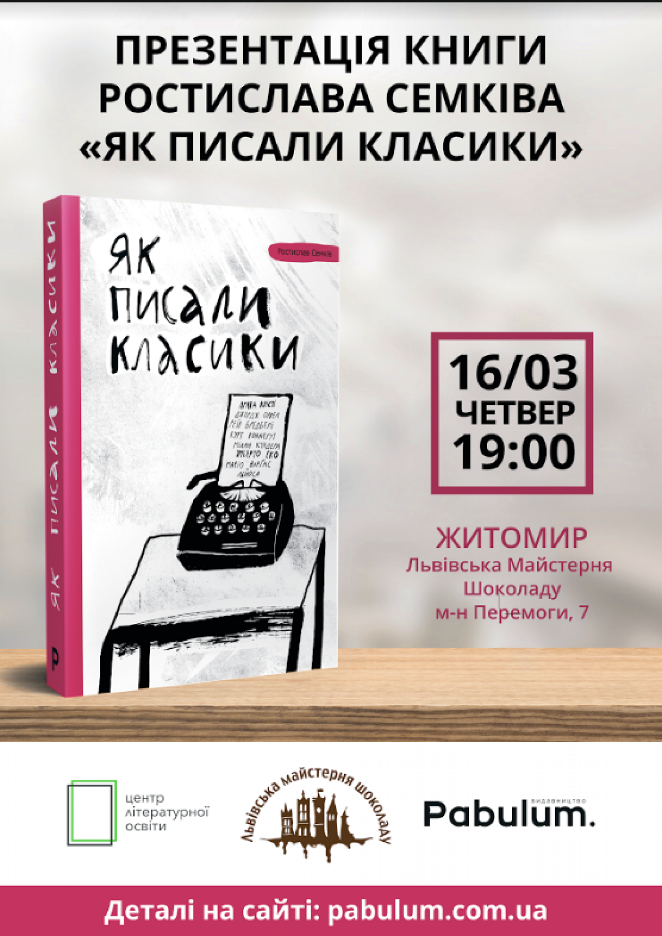 16 березня о 19:00 у Житомирі відбудеться презентація книжки відомого літературознавця, критика, директора Українського інституту книги Ростислава Семківа – «Як писали класики». Видання підсумовує рецепти успіху визнаних у всьому світі письменників. На презентації автор розкаже основні секрети письменницької майстерності класиків. Місце проведення – Львівська Майстерня Шоколаду (м-н Перемоги, 7). Про книгу: Серед визнаних письменників є ті, котрі вирішили поділитися секретами свого успіху й написали книжки про те, як писати добре. Це видання підсумовує погляди на художню творчість мегапопулярних Агати Крісті, Джорджа Орвелла, Рея Бредбері, Курта Воннеґута, а також ближчих до нас у часі Мілана Кундери, Маріо Варґаса Льйоси та Умберто Еко. Чому вони писали? Як вони писали? Й чому насправді вони стали успішними? Це збірка практичних порад, котрі підтверджені визнанням читачів на усіх континентах. Про автора: Ростислав Семків – автор, літературознавець, критик, перекладач, директор видавництва «Смолоскип», доцент кафедри літературознавства Києво-Могилянської Академії, в.о. директора Українського інституту книги. Лектор «Центру літературної освіти». Стажувався у Гарвардському університеті. Член журі багатьох літературних премій (зокрема «Коронація слова», «Книга року BBC» та ін.). Дата і час: 16 березня (четвер), початок о 19:00 Місце проведення: Львівська Майстерня Шоколаду (м-н Перемоги, 7) Контактна особа: 068-803-24-97 (Дмитро) Вхід – вільний! Організатори: видавництво «Pabulum», Львівська Майстерня Шоколаду Детальніша інформація про книгу: facebook.com/pabulum.publishing [email protected] pabulum.com.ua
