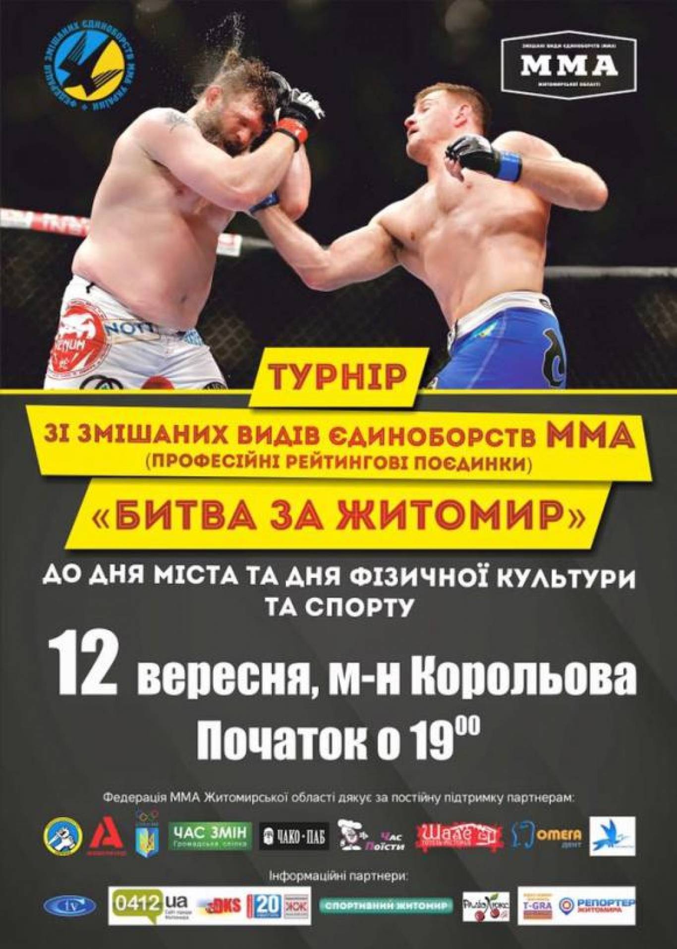 Увечері, 12 вересня, у центрі міста на майдані Корольова відбудеться турнір зі змішаних видів єдиноборств MMA «Битва за Житомир».